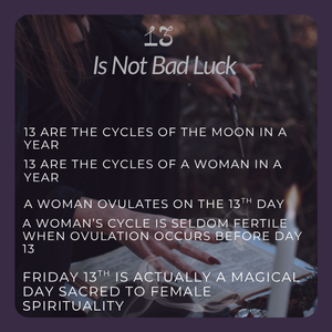 Instead of viewing 13 as an unlucky number, it can be seen as a vessel of Divine Feminine energy a number associated with the Divine Mother, transition, death, rebirth, fertility, blood, power, and life.